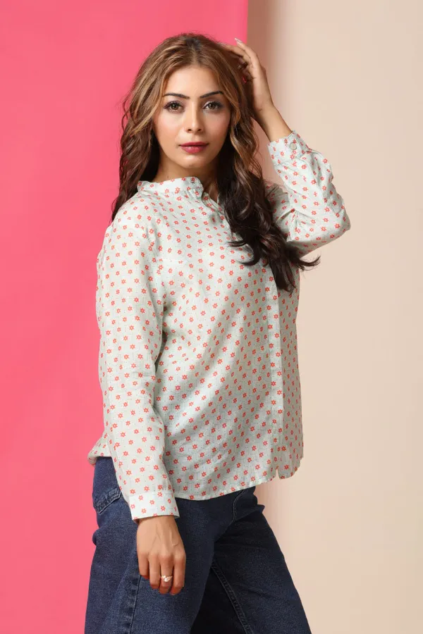 Sheer Mint Flower Print Muslin Band Collar Shirt